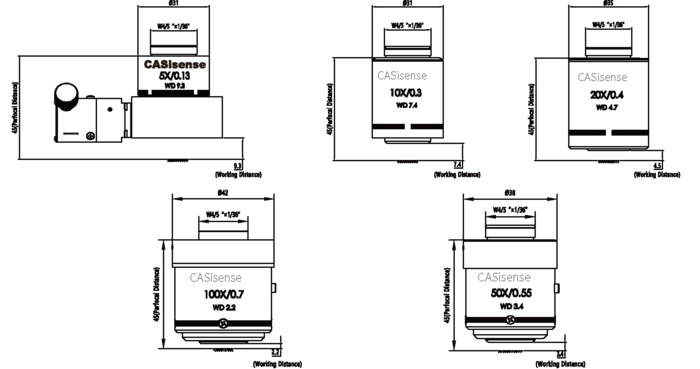 | 倍率 | 焦距(mm) | 工作距离(mm) | 齐焦距离(mm) | 连接螺纹 | 数值孔径 | 物方视场(mm) |